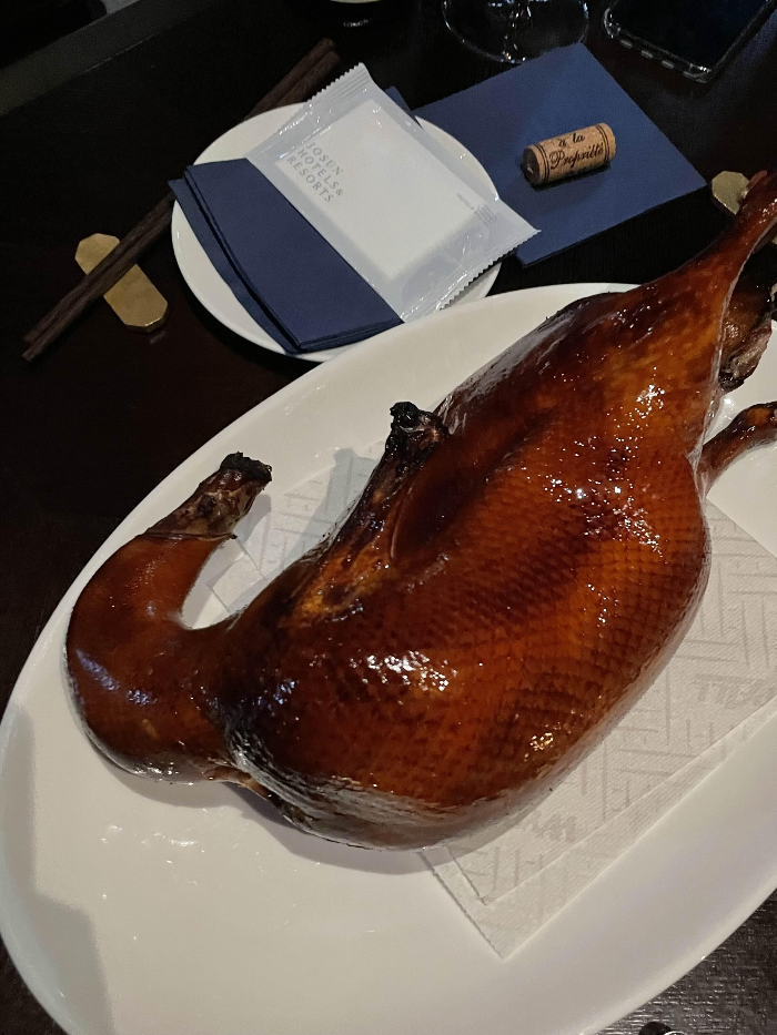 드디어 등장한 북경오리, 사진 한번 찍을 수 있게 해주시고 바로 해체 작업 도와주신답니다. 이렇게 보면 작은 사이즈는 아닌 듯 하지만 썰어보면 생각보다 양이 많지는 않아서 아쉬워요. 북경오리 가격은 18만원으로 확실히 저렴하진 않습니다