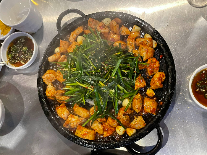 다음은 특양 2인분, 역시나 다른 불판에 미리 구워져서 나오기 때문에 바로 먹을 수 있다는 장점이 있어요. 일반 곱창과 달리 양념이 되어 나오는게 특징인데 진짜 맛있습니다. 양념이 진한 편이고 특양의 쫄깃한 식감이 넘 찰떡이였답니다. 매콤한 양념 덕에 느끼하지도 않고 부추와 같이 먹으니 순삭이였답니다. 소곱창과 특양 모두 너무 맛있었지만 소곱창으로 2인분 추가주문해서 먹었답니다.
