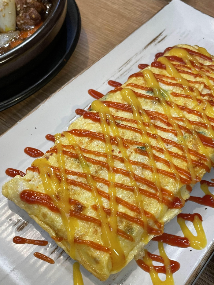 그리고 꼭 먹어보고 싶었던 메뉴인 묵은지 치즈계란말이, 계란말이 자체도 맛있는데 거기에 묵은지와 치즈가 들어갔다? 이건 실패하기도 어려운 조합이겠죠. 거기에 머스타드와 케찹까지 곁들이니 진짜 순삭할정도로 맛나더라구요. 폭신한 계란과 치즈 식감에 묵은지가 씹히는 느낌 , 담에 저녁 먹으러가서도 계란말이는 꼭 시켜먹을 예정이에요.